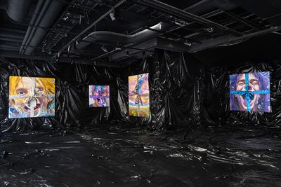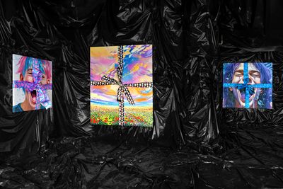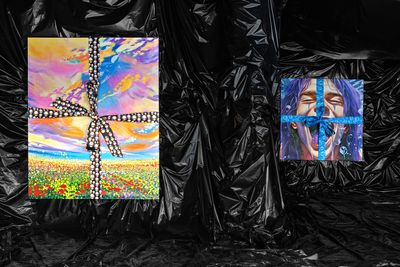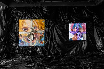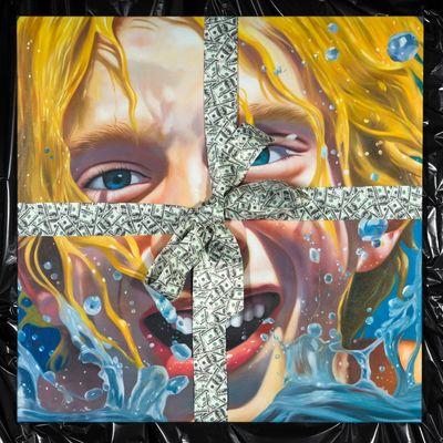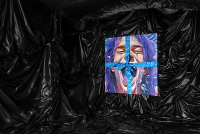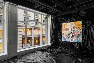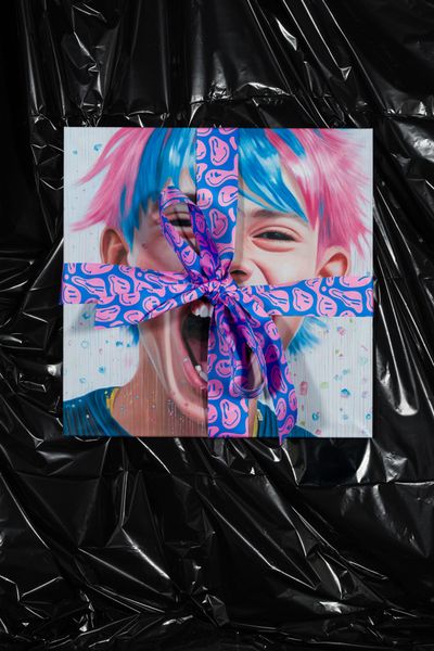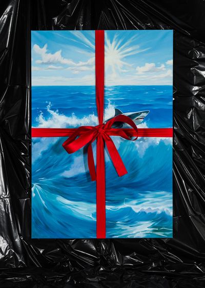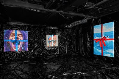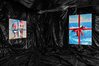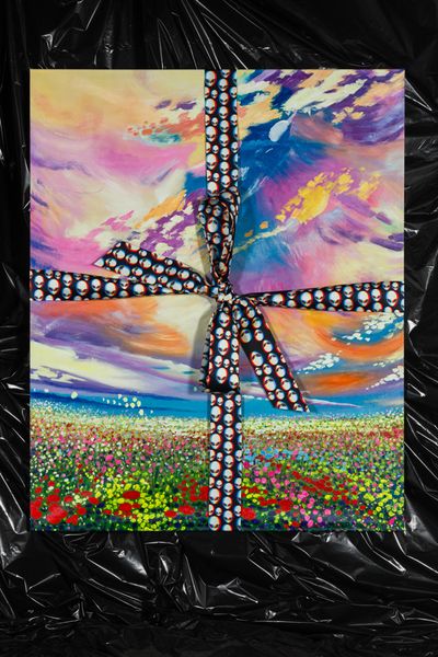 Behind this intentionally unmarked storefront lies a semi-secret exhibition of exceptional works by Eliza Douglas. Drawn from her first AI-inspired body of work, each oil painting is wrapped in an oversized three-dimensional fabric bow some of which have been made by Balenciaga’s couture studio and others handmade by Berlin based designer Don Aretino.