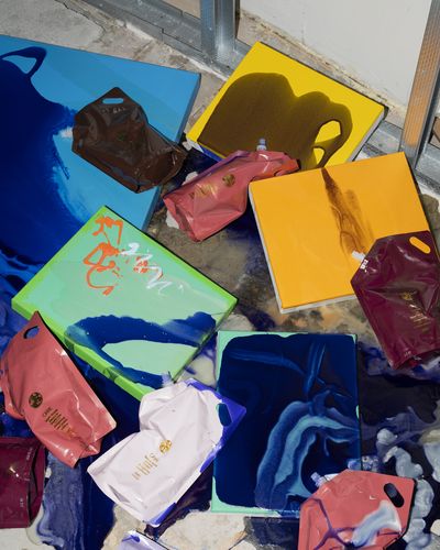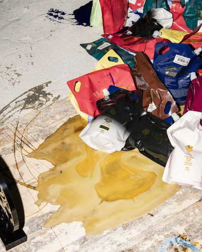 Continuing this exploration of unconventional materials, for Midnight Ride: Oribe Paintings his solo exhibition at Nedre Slottsgate 8 Melgaard employs yet another unexpected medium: Oribe shampoo and conditioners. Founded by legendary hairstylist Oribe Canales, Oribe is a luxury haircare brand that is celebrated by beauty experts including top celebrity and editorial hairstylists. Known for high-performance formulas promising salon-quality results and glamorous hair-care experiences—the brand’s ethos is to transform everyday haircare routines into luxurious rituals emphasizing beauty and indulgence.