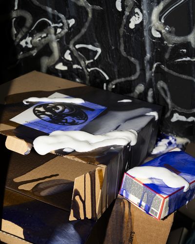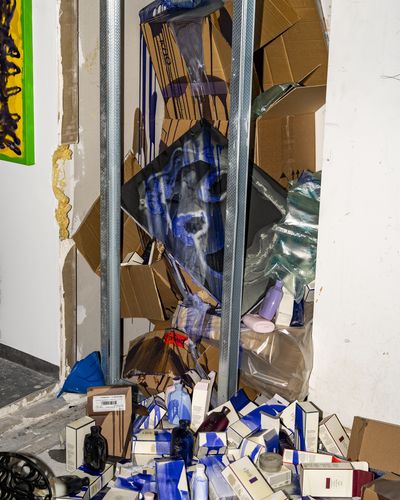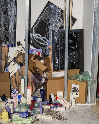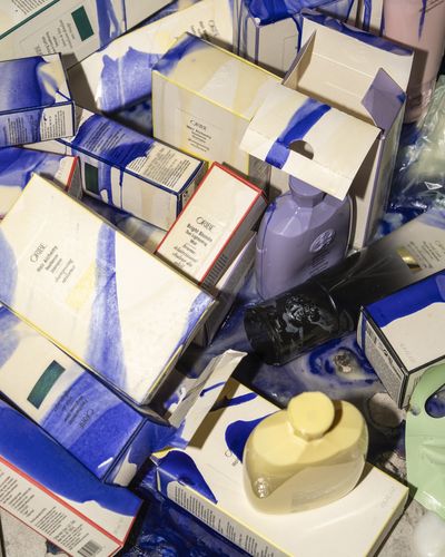 Mixed media installation with cardboard, assorted products, canvas and Oribe shampoo and conditioners.