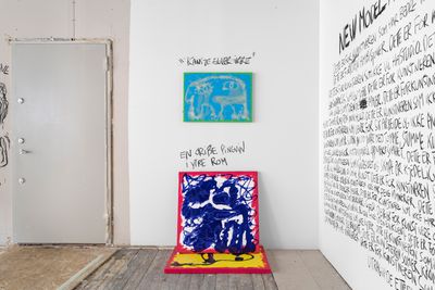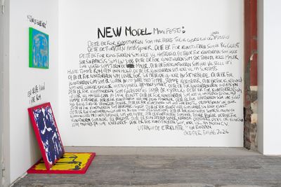 A text excerpt from a freshly written novel by the artist, that will be published by Forlaget Oktober next year, anchors the exhibition in the form of a wall drawing executed in charcoal. Given the title “New Model Manifesto,” it dedicates the work, and possibly the show to fellow artists — a confident and defiant address of ambivalence and contradiction, “For the artist who has better things to do than be in the studio.”