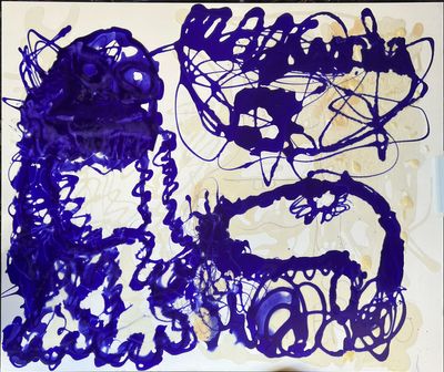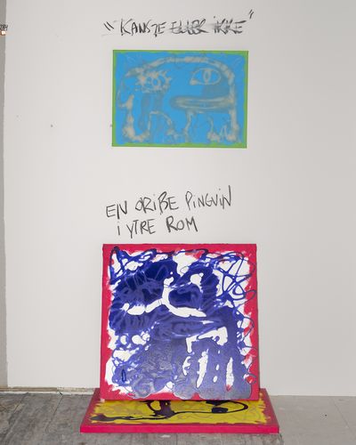 Painting (Melgaard): Acrylic, shampoo and conditioner on canvas Drawing (Melgaard & Ytre-Eide): oil pastels and marker on paper