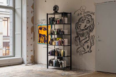 Mixed media installation with charcoal, metal shelves, assorted products and painting made with Oribe shampoo.
